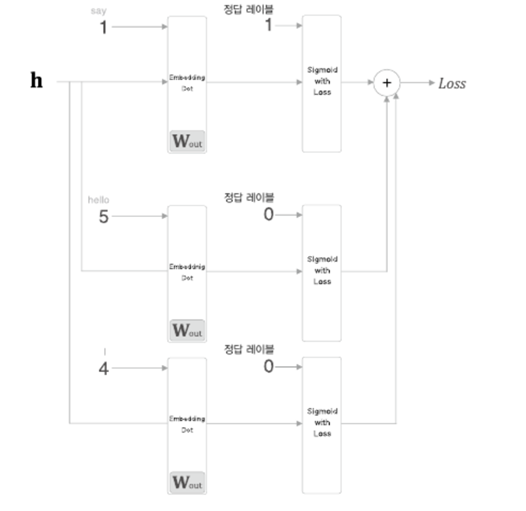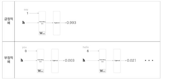 - 네거티브 샘플링은 부정적 예를 몇 개 샘플링한느 기법으로, 이를 이요하면 다중 분류를 이진 분류처럼 취급