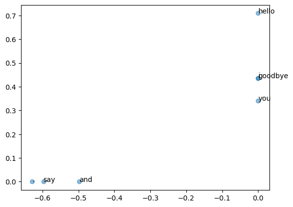 id_to_word:{0: 'you', 1: 'say', 2: 'goodbye', 3: 'and', 4: 'i', 5: 'hello', 6: '.'}