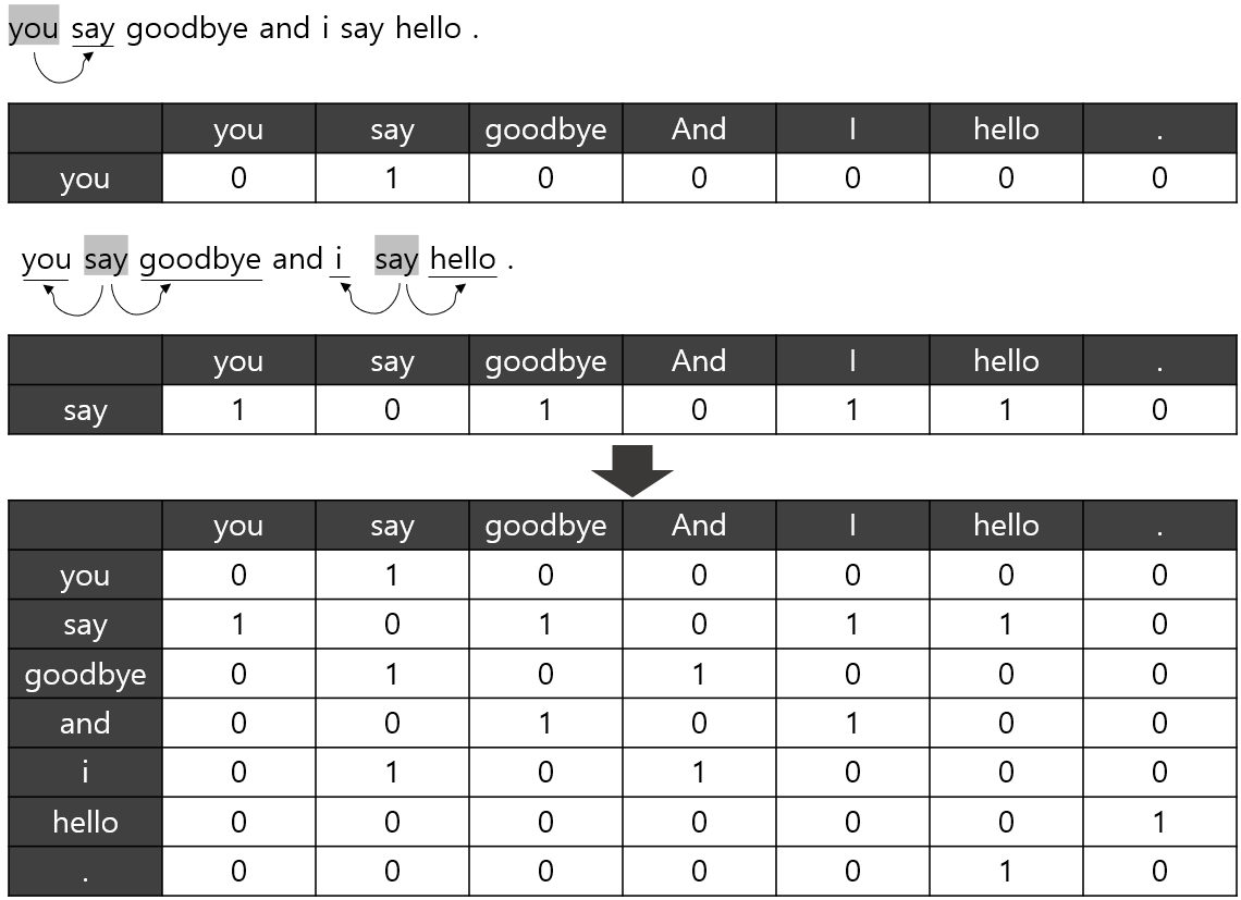 - 어떤 단어에 주목했을 때, 그 주변에 어떤 단어가 몇 번이나 등장하는지를 세어 집계하는 방법