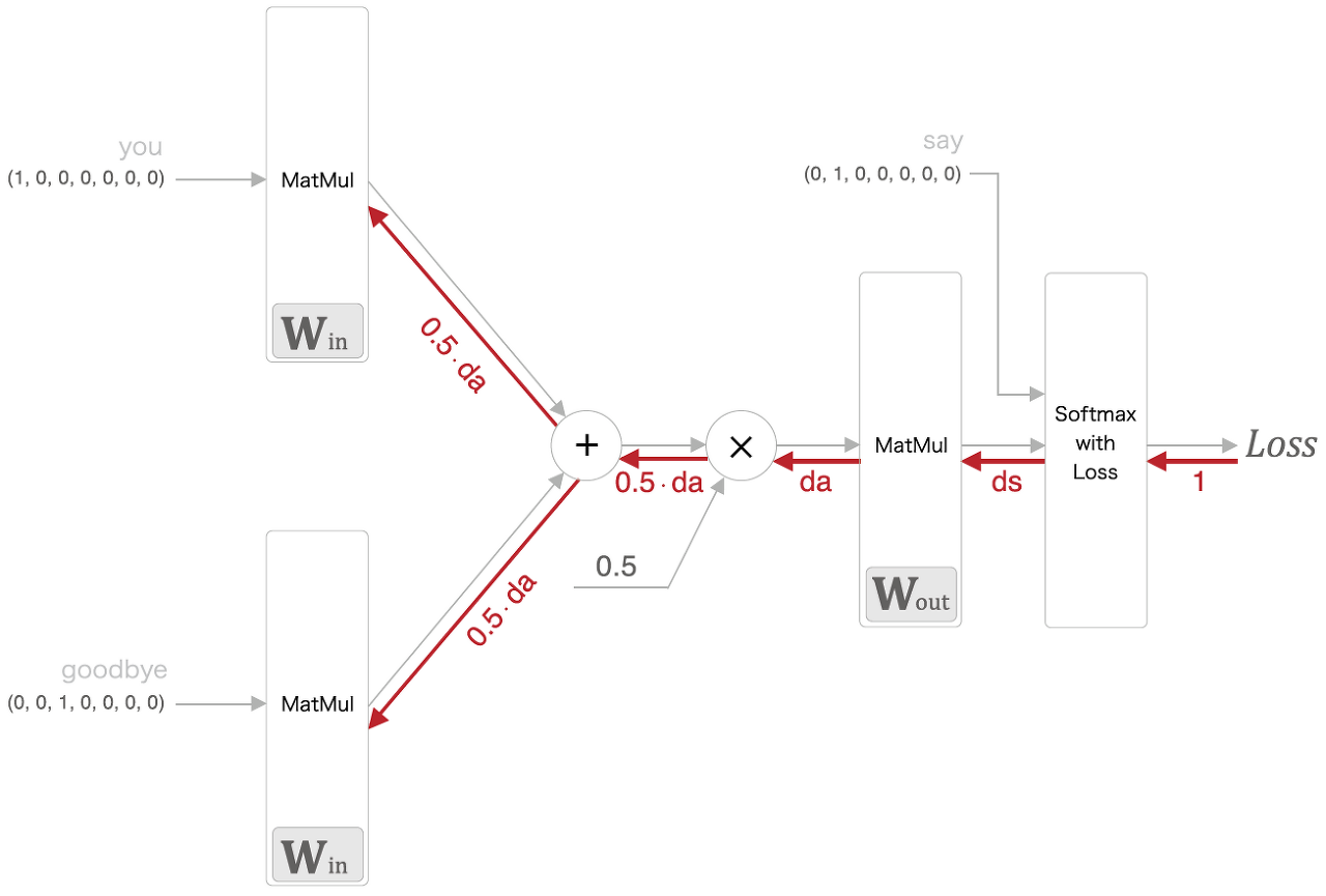 - Embedding 계층은 단어의 분산 표현을 담고 있으며, 순전파 시 지정한 단어 ID의 벡터를 추출