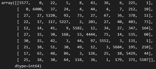 # 첫 행부터 실제 0일 때 0으로 예측한 개수, 1로 예측한 개수, 2로 예측한 개수...