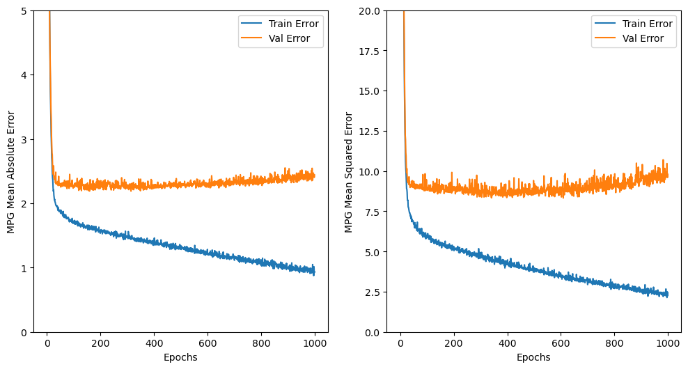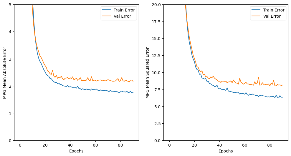 검증데이터의 오차(Val Error)값이 mae, mse 값 모두 일정 값 이하로 더이상 떨어지지 않음