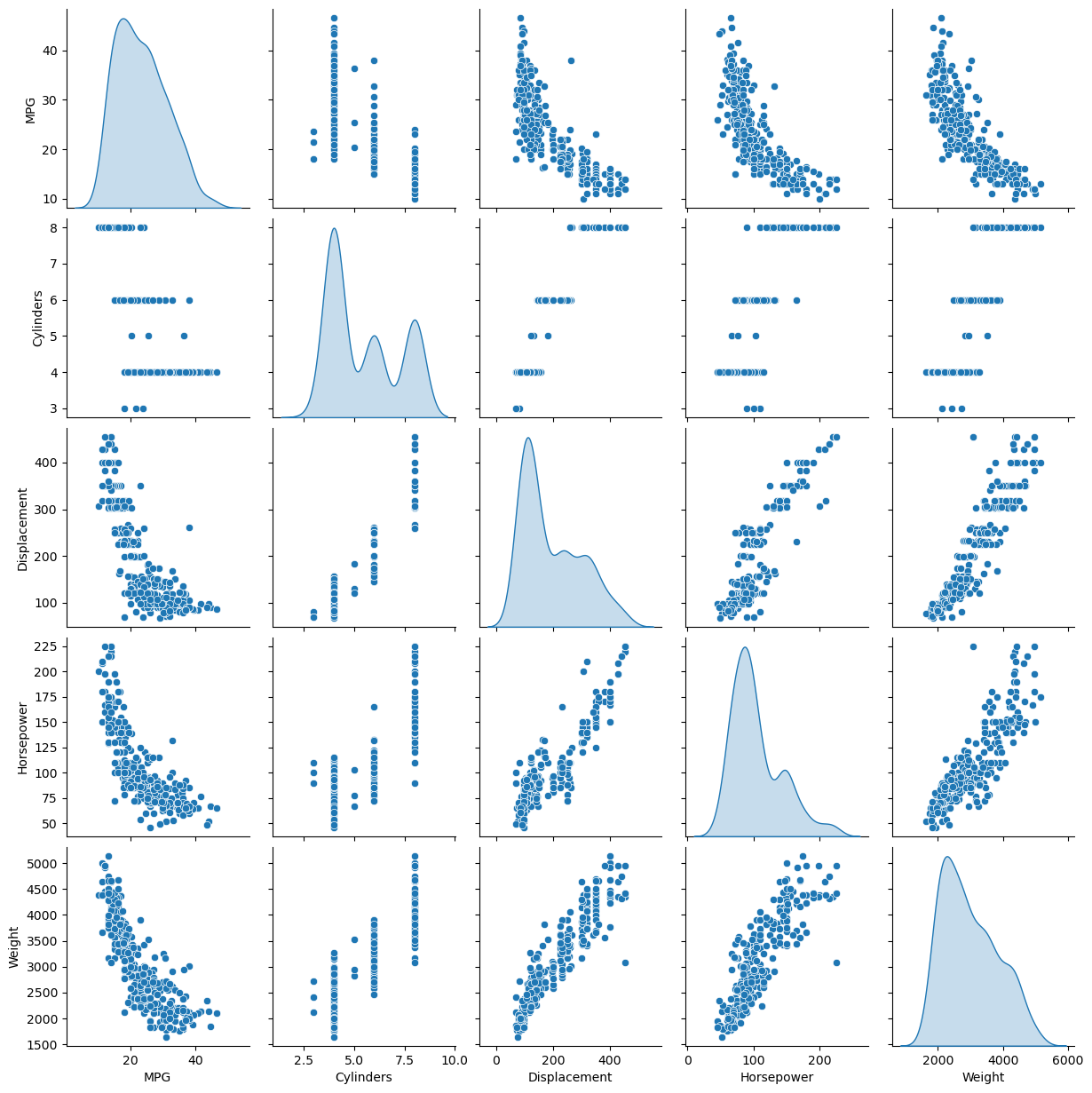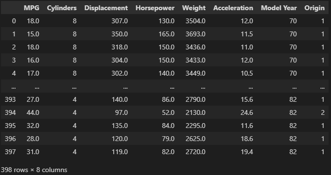 column_names = ['MPG', 'Cylinders', 'Displacement', 'Horsepower', 'Weight','Acceleration','Model Year', 'Origin']