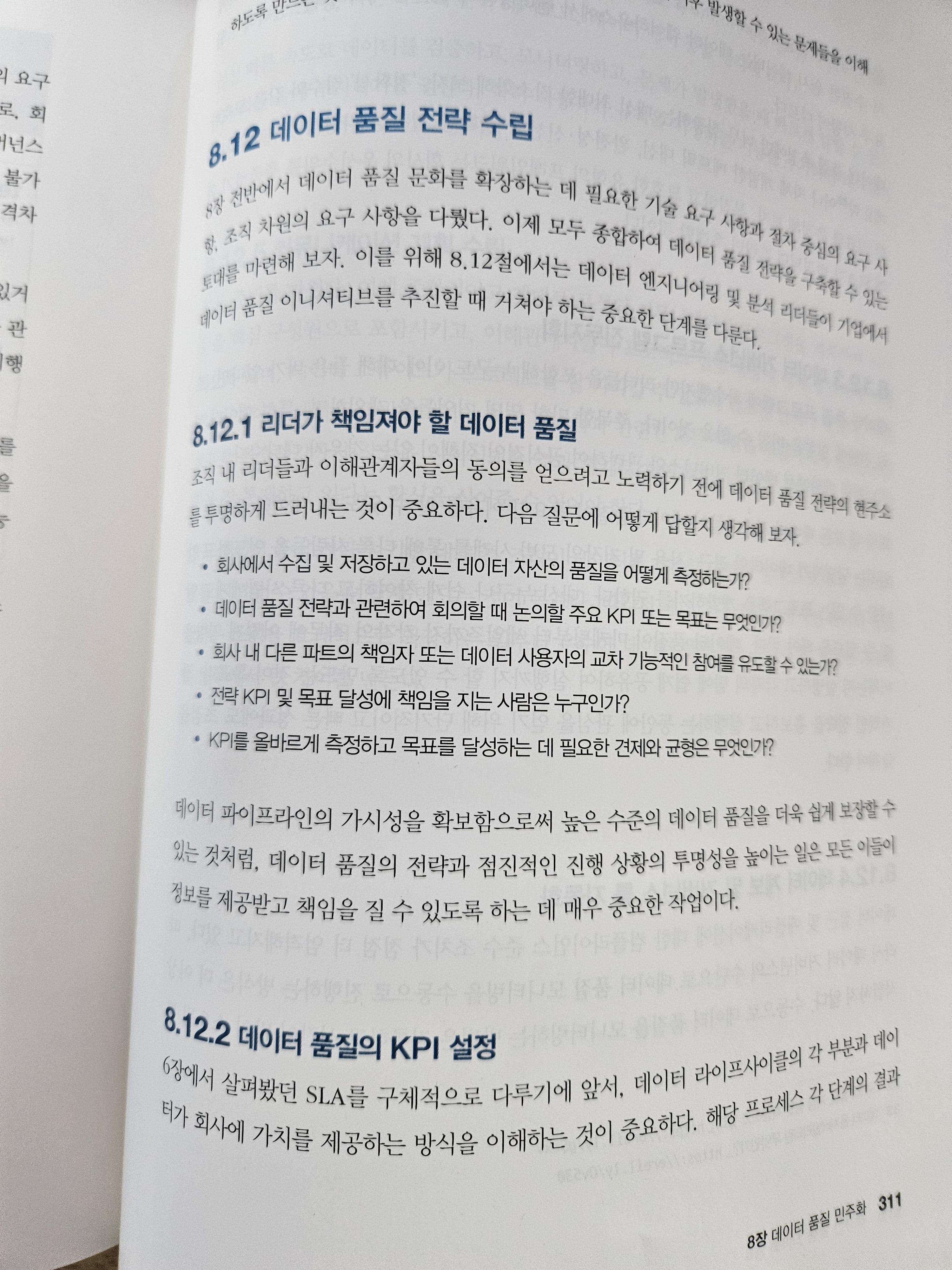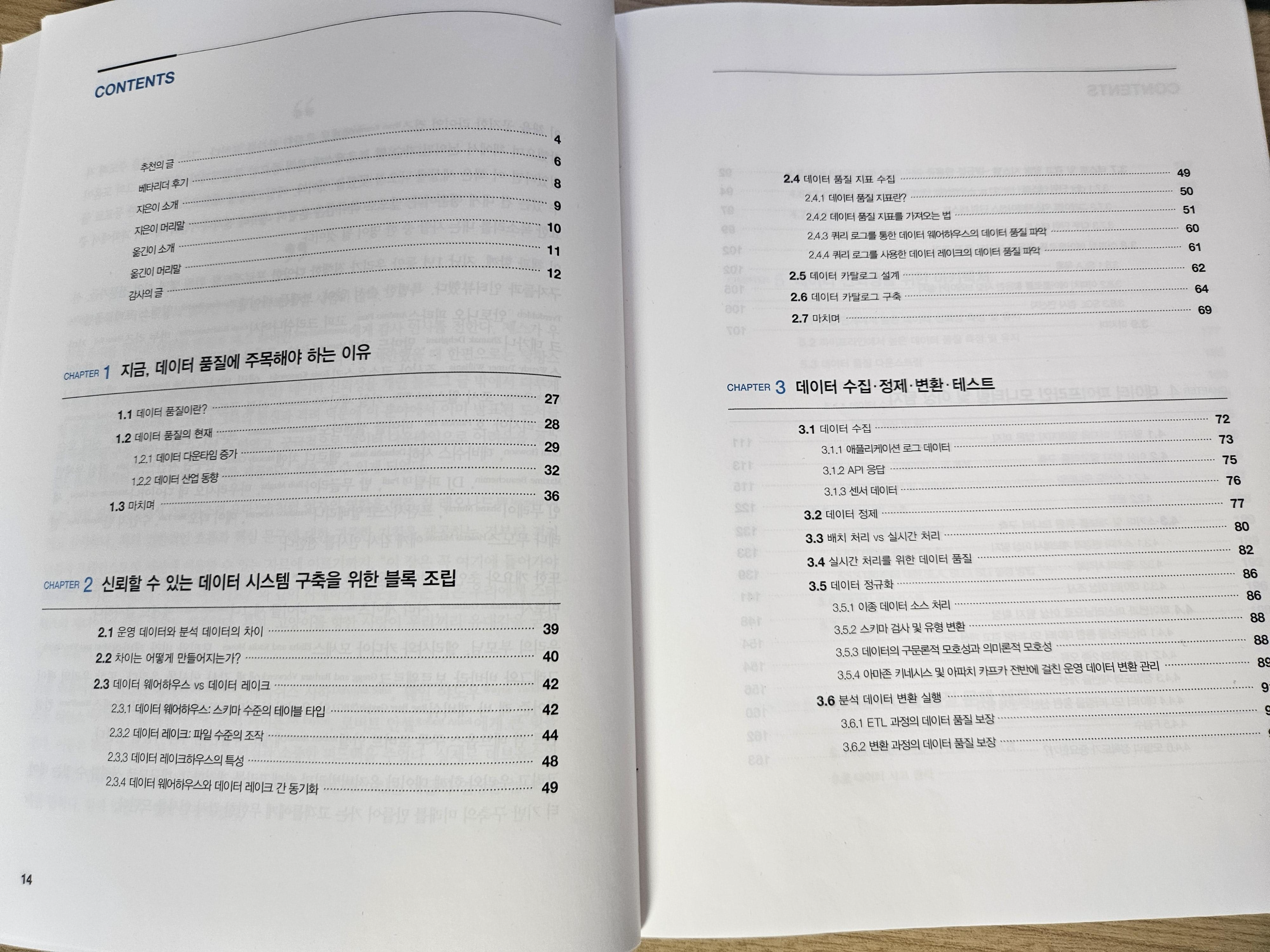 데이터 품질이 정말 중요하다고 느껴 공부하기 위해 서평 이벤트에 참여하여 해당 책을 받기는 했지만 정말 많은 도움이 되었던 것 같습니다. 데이터 품질에 관한 O'REILLY의 첫번째 책이라는 점에서 책장에 하나 쯤 있어도 좋겠다는 소장 욕구가 생기기도 하고 두고두고 데이터 품질을 관리하기 위해 읽을 수 있는 책인 것 같습니다.