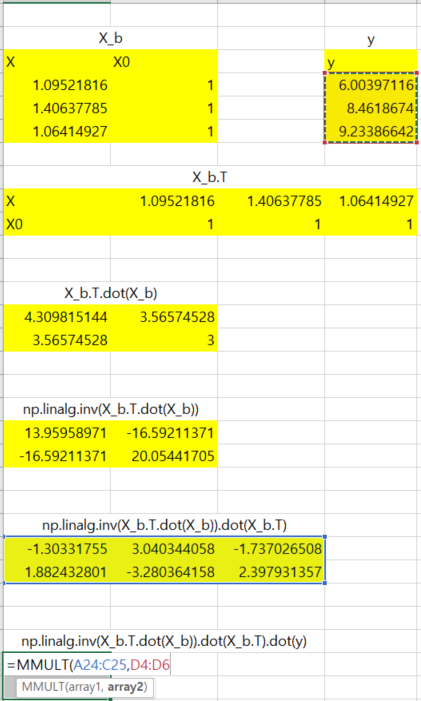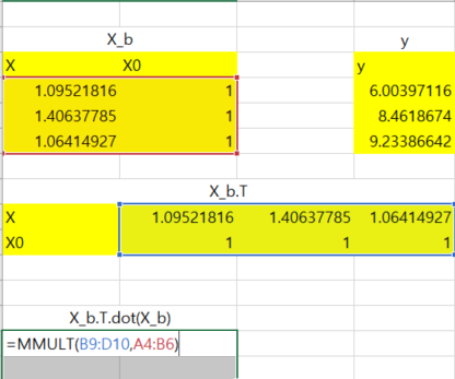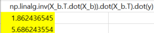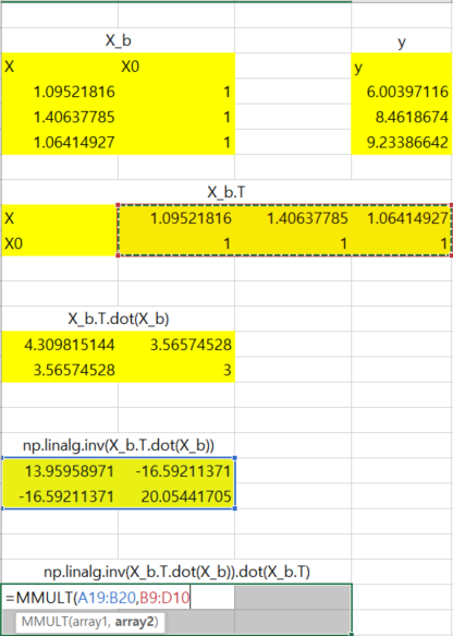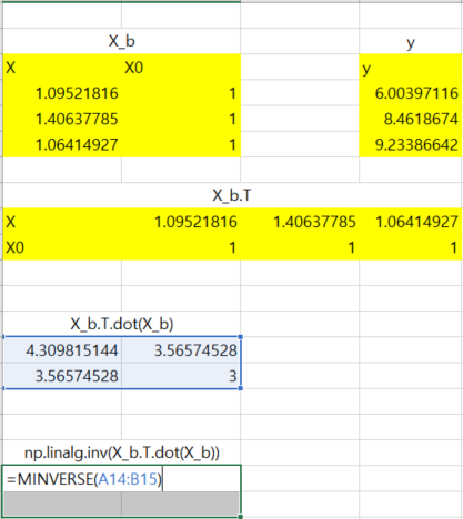 -엑셀을 이용해 theta_best=np.linalg.inv(X_b.T.dot(X_b)).dot(X_b.T).dot(y) 계산과정 설명