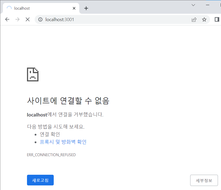 - 주소창에 'localhost:3001'을 입력하면 위에 로딩되는 것이 뜨면 서버가 열린 것