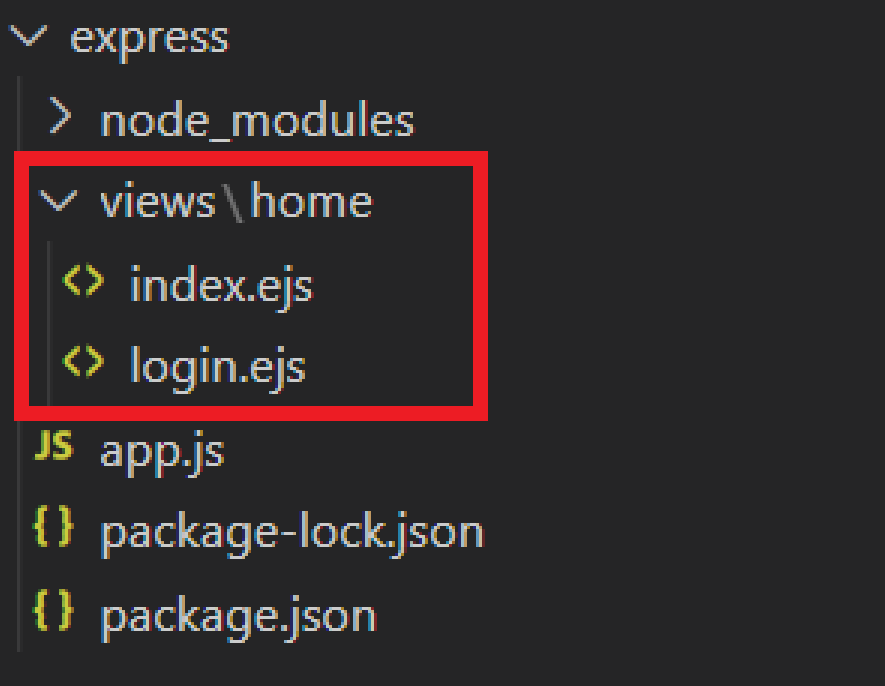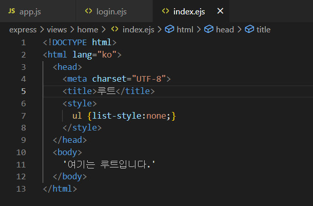 -home 폴더 내에 index.ejs, login.ejs 파일을 생성하여 각각 '이곳은 루트입니다.'와 로그인화면의 html 코드를 붙여넣기