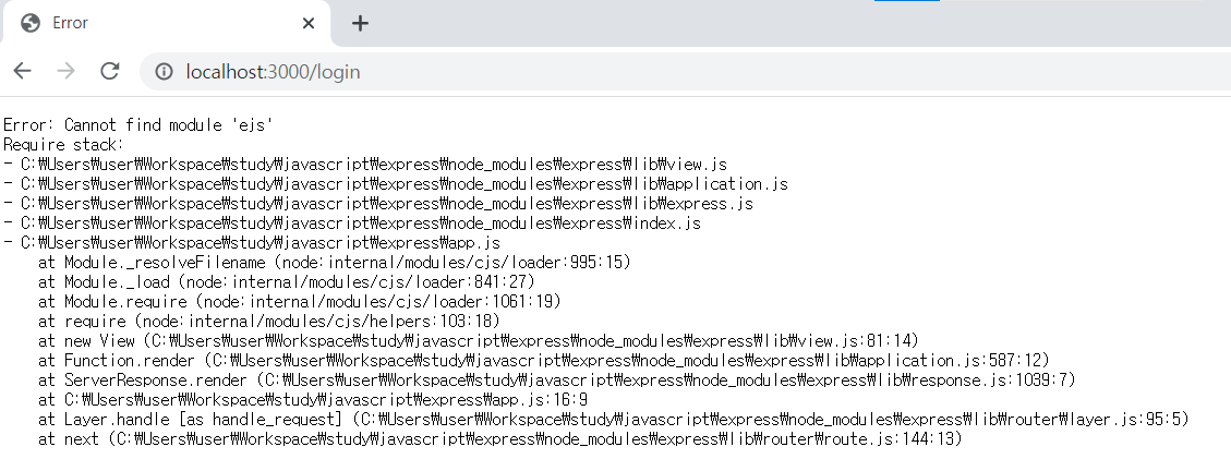 4) 서버 가동 시 ejs 모듈을 찾을 수 없다는 에러가 뜨므로 ejs 모듈 설치