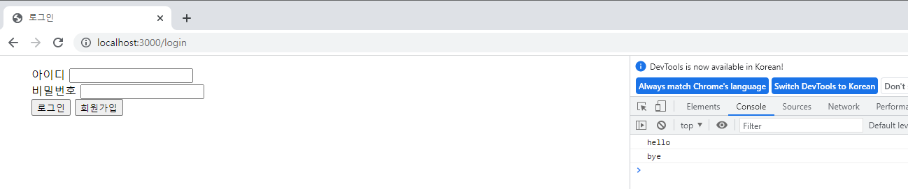 5) 서버 가동 후 localhost:3000/login에 접속하면 다음과 같이 자바스크립트 파일의 동작이 실행됨