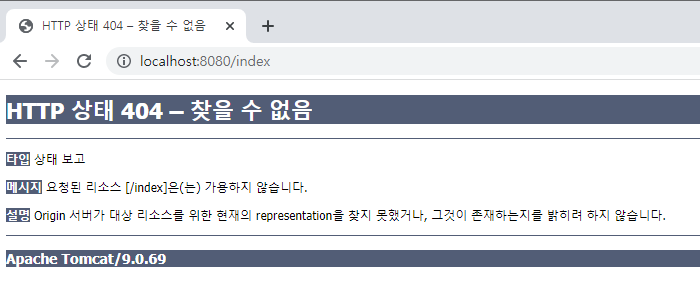 - sendRedirect를 통해 처리가 끝난 후 '/index' 경로를 호출하여 해당 페이지가 나오며, 아직 '/index'의 Controller를 생성하지 않아서 위의 에러가 발생