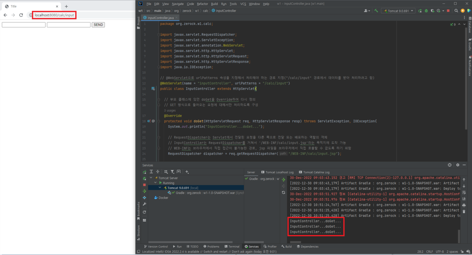 - 또한, doGet이 실행됐을 때 "InputController...doGet..."이 print되도록 하여 로그에 "InputController...doGet..." 출력됨