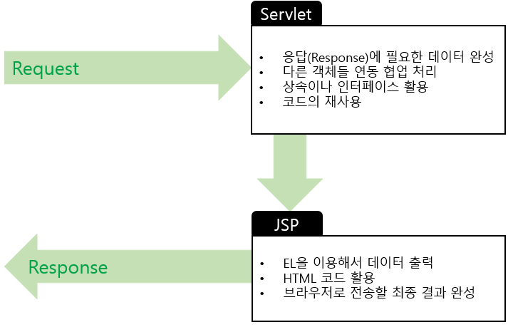 - 절충안: 브라우저 요청은 해당 주소를 처리하는 Servlet에 전달 → Servlet 내부에서 응답에 필요한 재료 데이터 준비 → 준비한 데이터를 JSP에 전달 → JSP는 EL을 이용해 최종 결과 데이터 생성