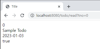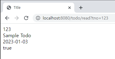 - 그 결과, 다음과 같이 주소창에서 /todo/read 경로에 쿼리 스트링을 통해 ?tno=번호를 파라미터로 전달하면 TodoDTO 객체의 내용 확인 가능