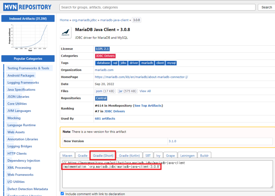 - 구글에 'mariadb maven'을 검색하여 MariaDB Java Client에서 Gradle 또는 Gradle(Short의 내용을 복사하여 사용