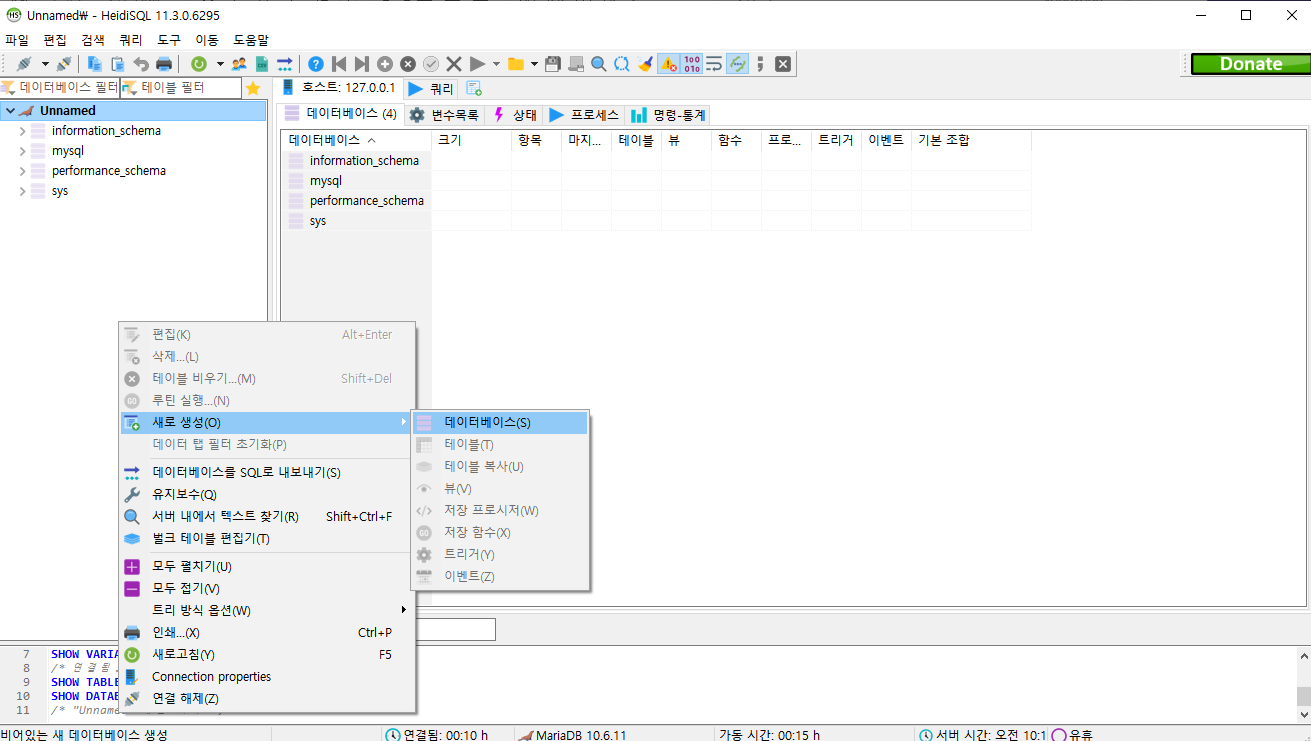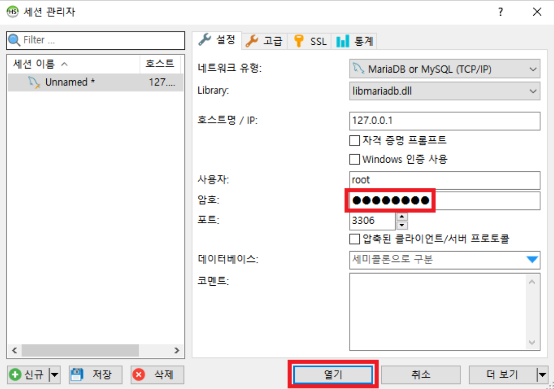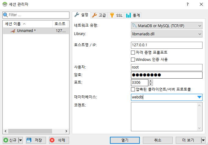- '신규 ' 버튼을 눌러서 root 계정으로 연결