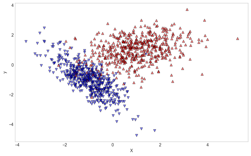 ax.scatter(X[i, 0], X[i, 1], edgecolors = 'k', alpha = 0.5, marker = 'v', color = 'b')