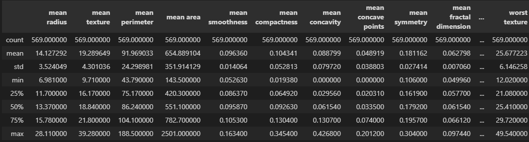 cancer_df = pd.DataFrame(cancer.data, columns = cancer.feature_names)