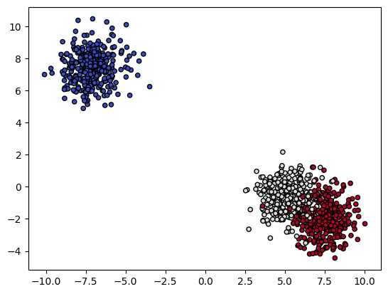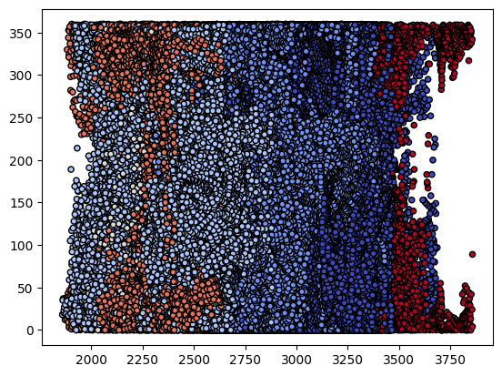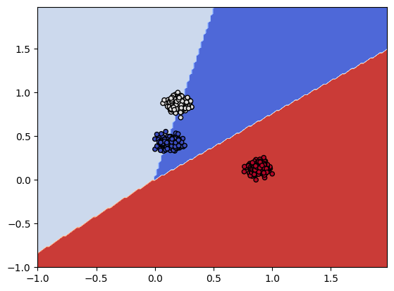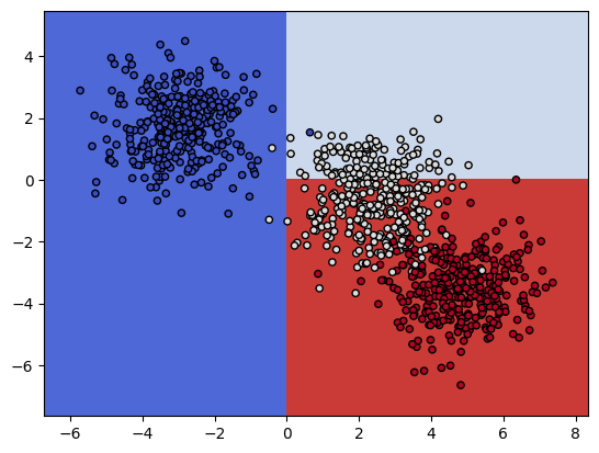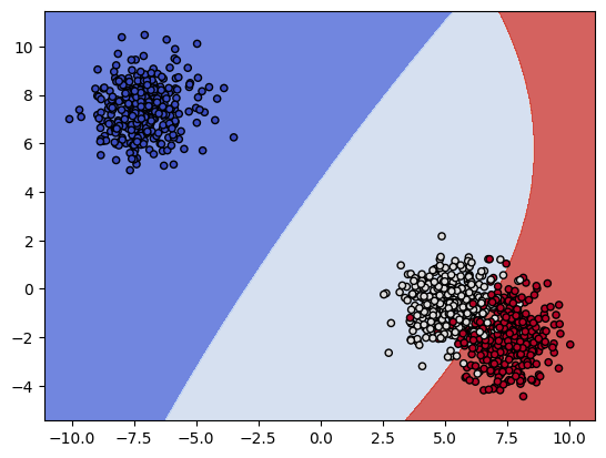 plot_contours(model, xx, yy, cmap = plt.cm.coolwarm, s = 20, edgecolors = 'k')