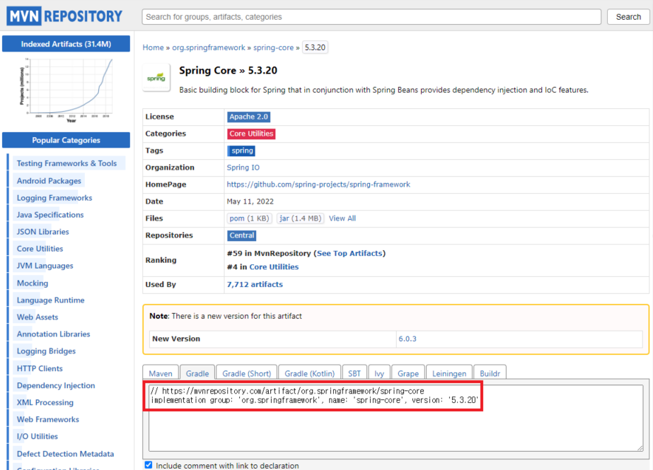 implementation group: 'org.springframework', name: 'spring-core', version: '5.3.20'