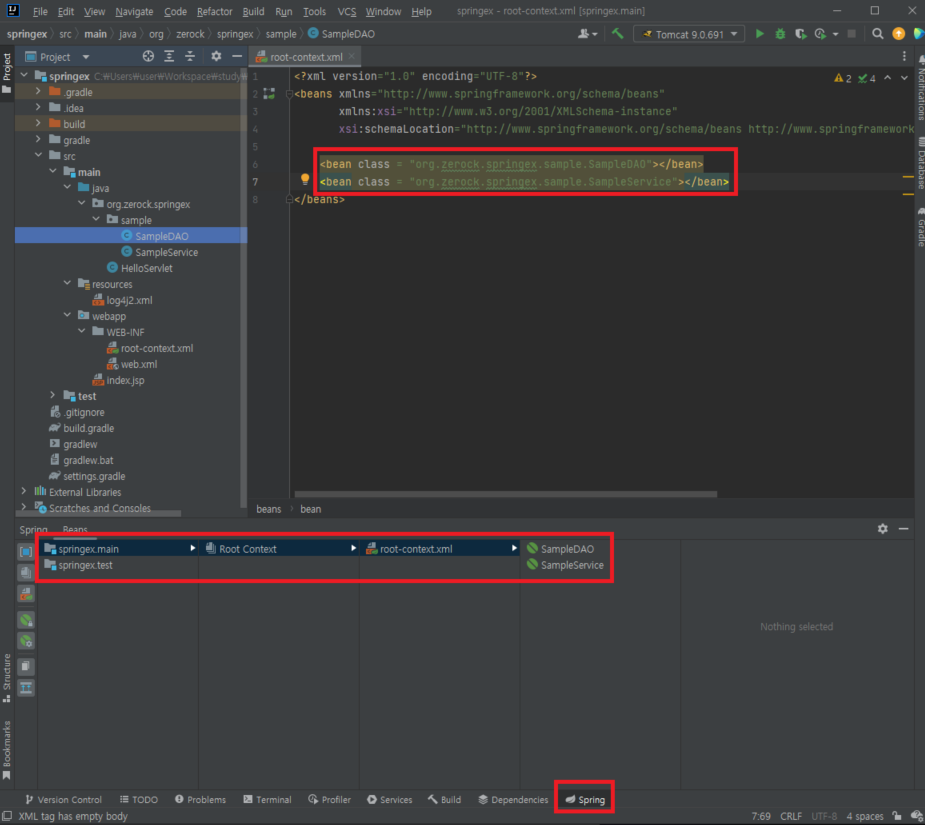- root-context.xml 내부에 <bean>이라는 태그를 이용해서 SampleService와 SampleDAO를 다음과 같이 설정