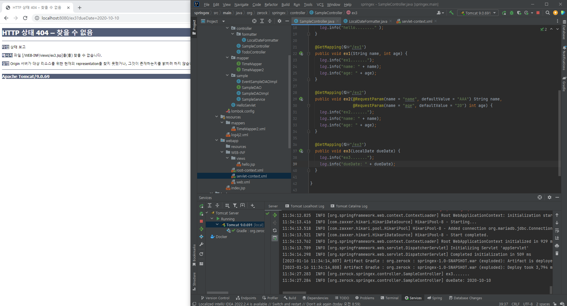 - org.zerock.springex 프로젝트 내에 controller 패키지 추가 > SampleController 클래스 추가