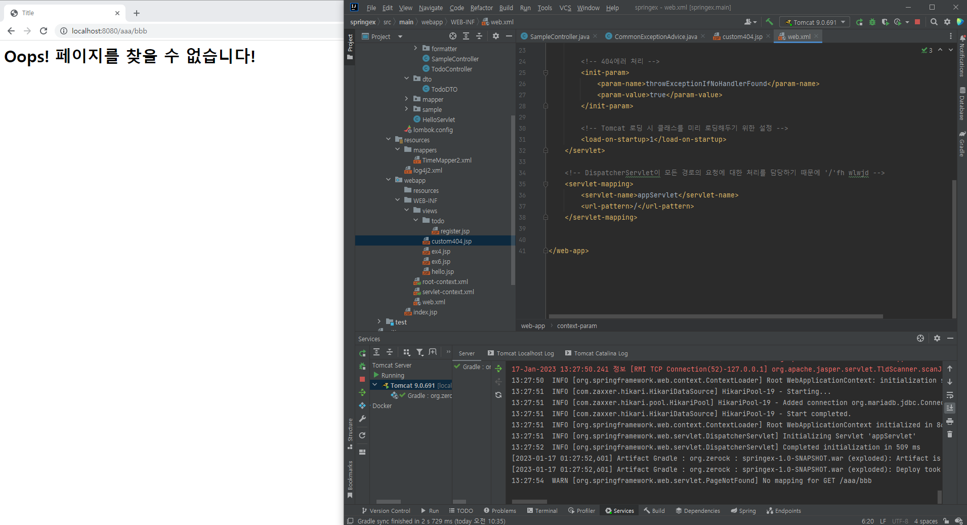 - <servlet> 태그 내에 <init-param>을 추가하고 throwExceptionIfNoHandlerFound라는 파라미터 설정 추가