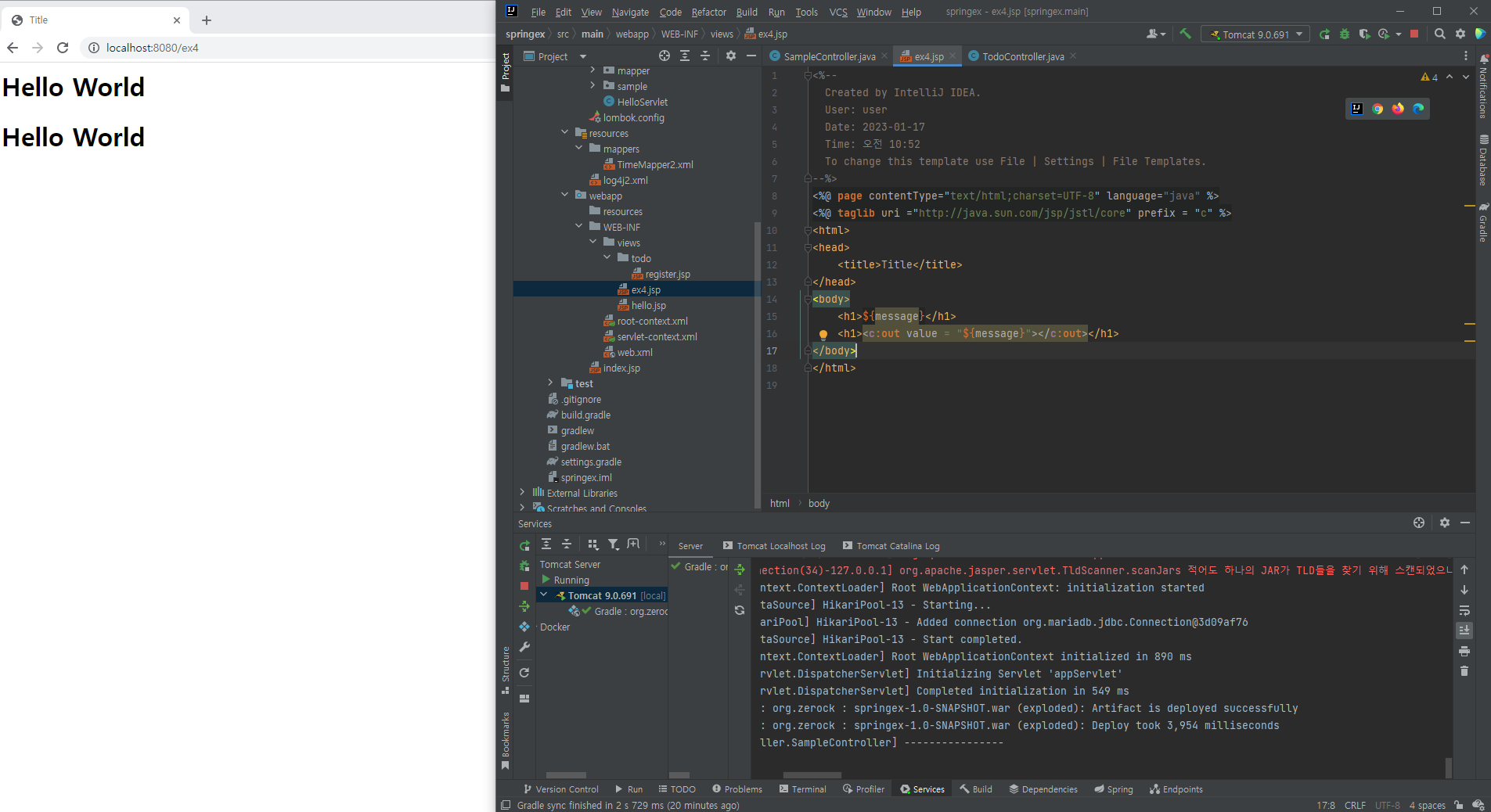 - "/hello" 경로의 화면을 간단하게 작성(webapp > WEB-INF > views 폴더 생성 > hello.jsp 파일 생성)