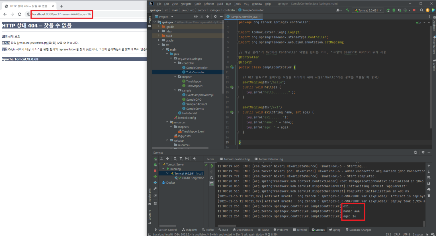 - "localhost:8080/ex7?p1=AAA&p2=BBB"를 주면 BBB는 int형이 아니므로 에러 코드 400이 발생