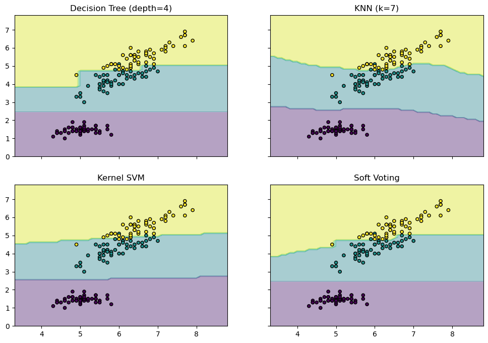 ['Decision Tree (depth=4)', 'KNN (k=7)', 'Kernel SVM', 'Soft Voting']):