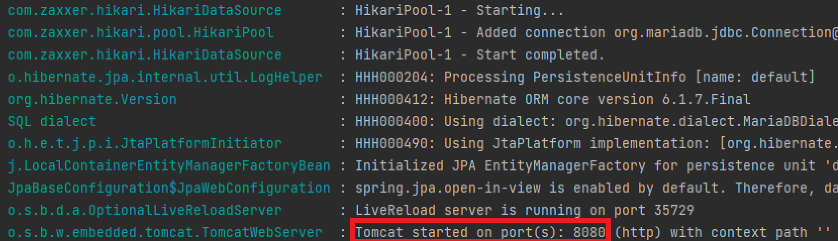 - 다시 실행하면 8080포트로 톰캣이 실행됨