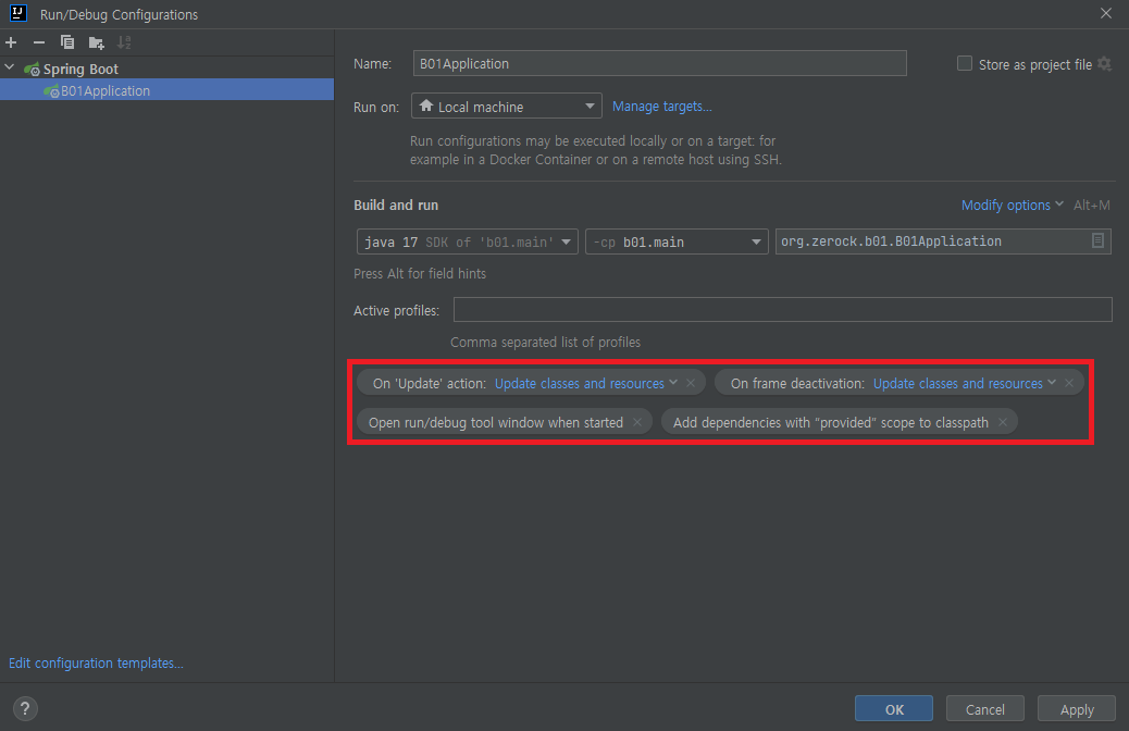 - 프로젝트 초기화할 때 실행 메뉴에 'B01Application이라는 이름으로 실행 메뉴가 구성됨