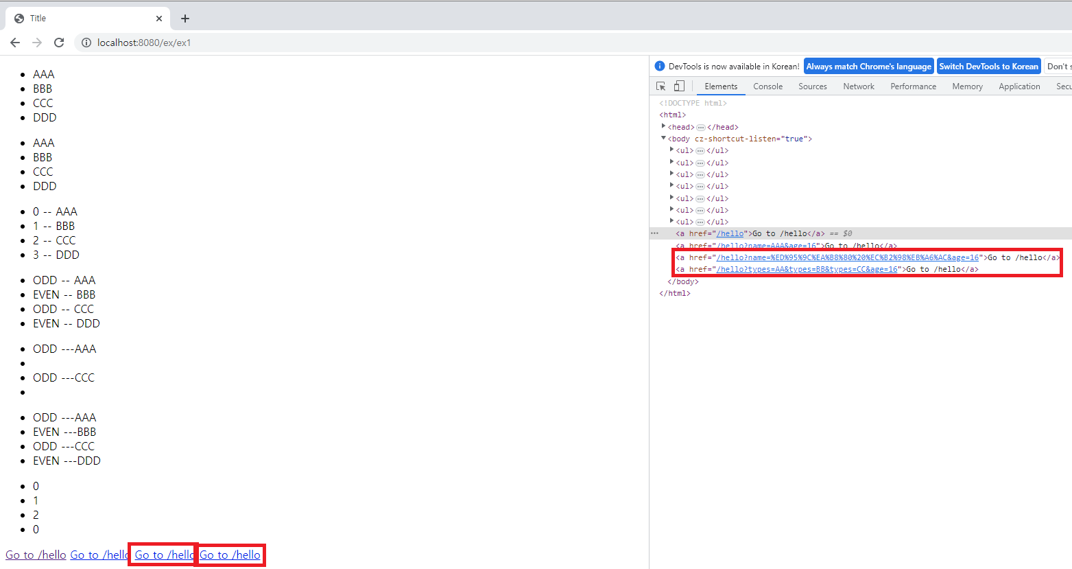 <a th:href="@{/hello(name='한글 처리', age=16)}">Go to /hello</a>