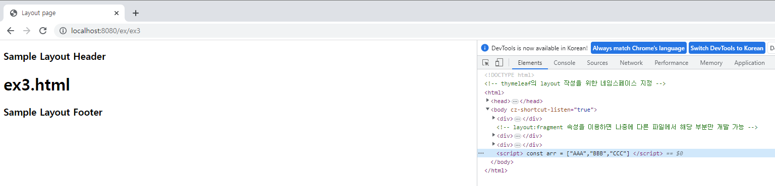 - layout1.html에서 layout:fragment 속성으로 처리했던 content와 script부분을 다른 파일인 ex3에서 개발할 수 있음
