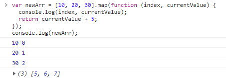 var newArr = [10, 20, 30].map(function (index, currentValue) {