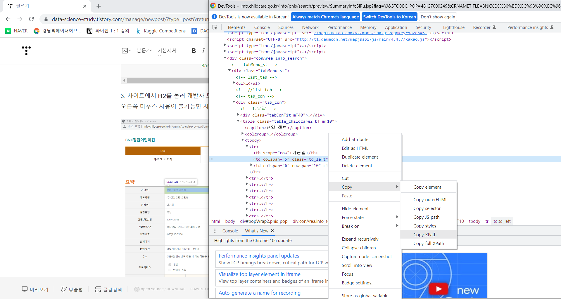 오른쪽 마우스 사용이 불가능한 사이트라 직접 화살표를 눌러가며 기관명, 주소, 설립유형, 제공서비스의 경로를 찾아 XPath를 복사