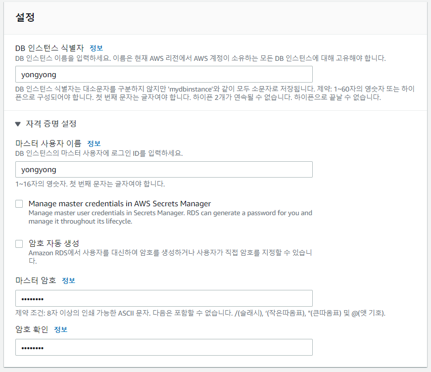 -Username: AWS RDS 생성 시 지정했던 Username 입력