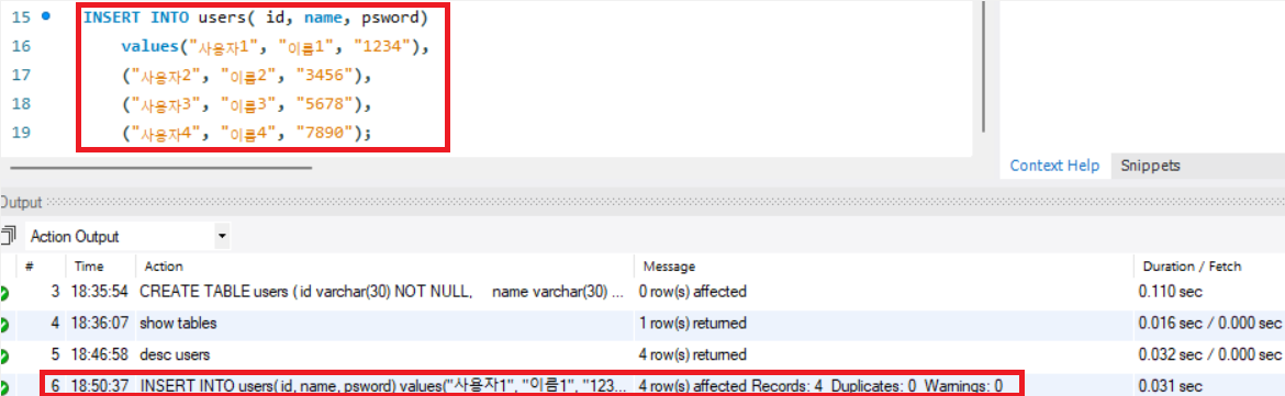("사용자4", "이름4", "7890"); // 마지막에는 세미콜론으로 SQL문의 끝을 알림