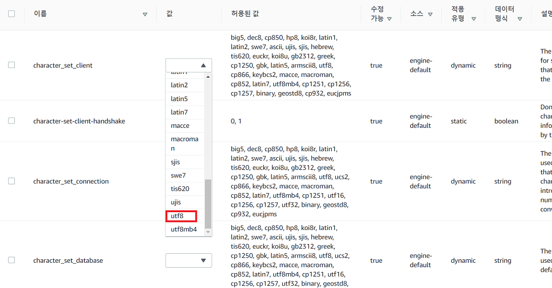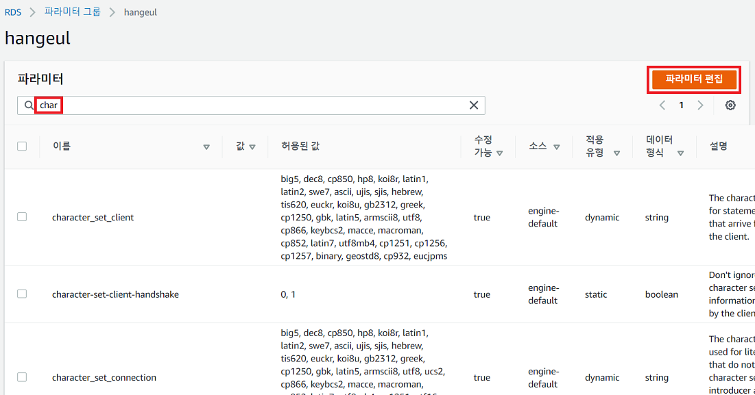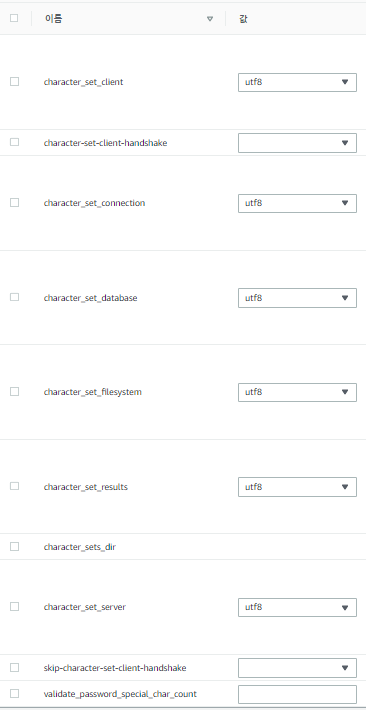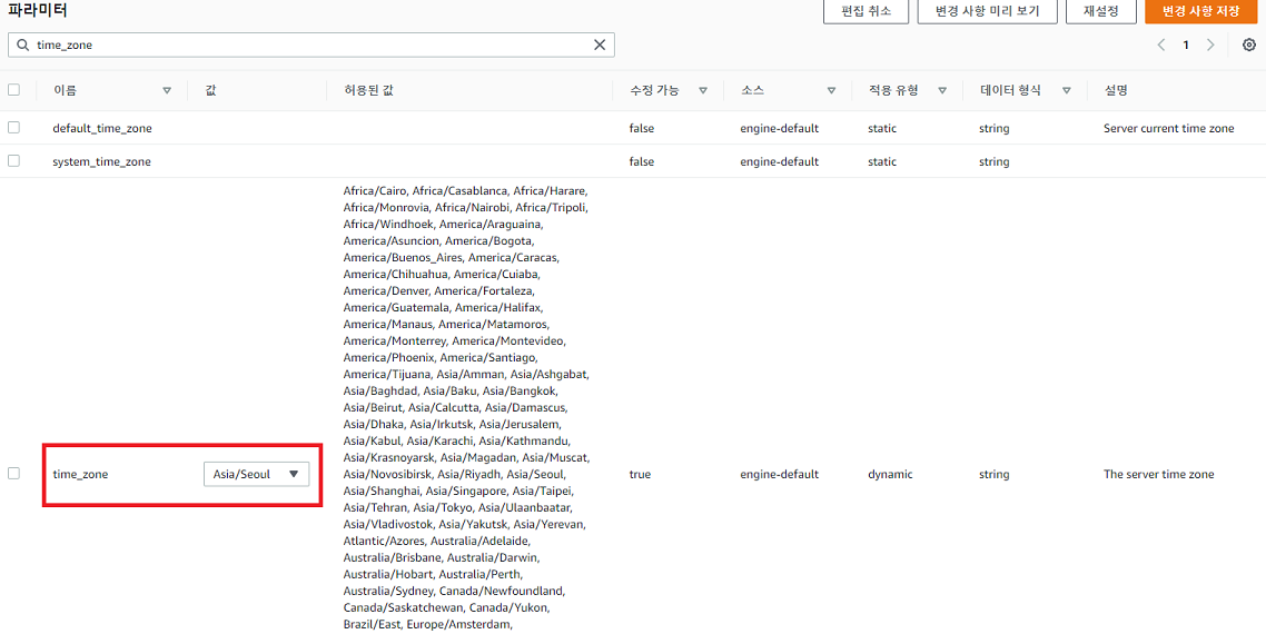 → in_date에서 시간에 오차가 있는데, AWS RDS 클라우드 시간과 현지 시간이 다르기 때문이므로, 파라미터 옵션의 time_zone 수정해야함
