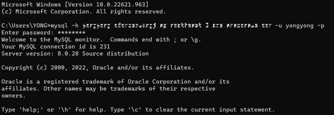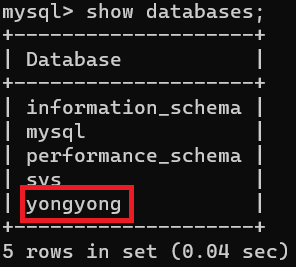 → user yongyong: yongyong 데이터베이스에서 작업