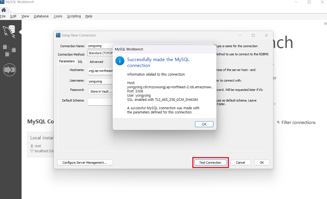 -Test Connection 클릭했을 때 다음과 같이 Successfully made the MySQL connection이 뜨면 잘 된 것 > OK 클릭