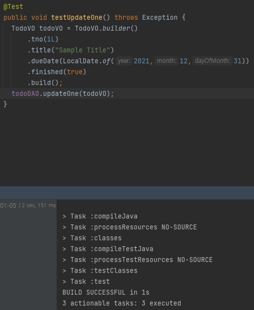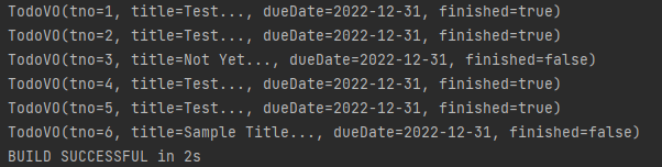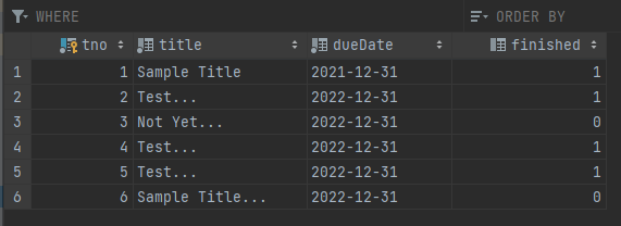 위의 코드 여러 번 실행실행 결과 tbl_todo에 데이터 여러 개가 추가 된 모습, tno는 자동으로 1부터 5까지 추가되어 있음