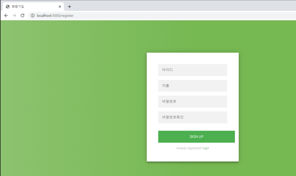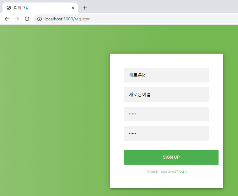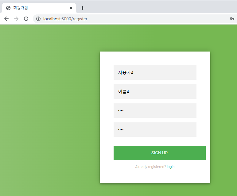 - 정보 입력 후 SIGN UP 클릭 시 데이터베이스에 해당 정보가 저장됨