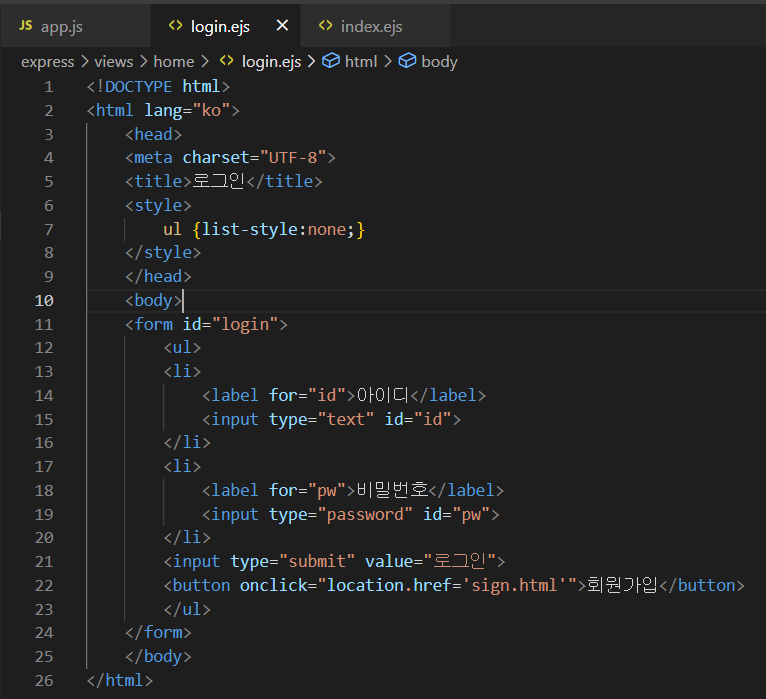 <script src="/js/home/login.js"></script> <!--app.js에서 use 미들웨어를 통해 public 폴더 내의 js/home/login.js로 접근할 수 있게 됨-->